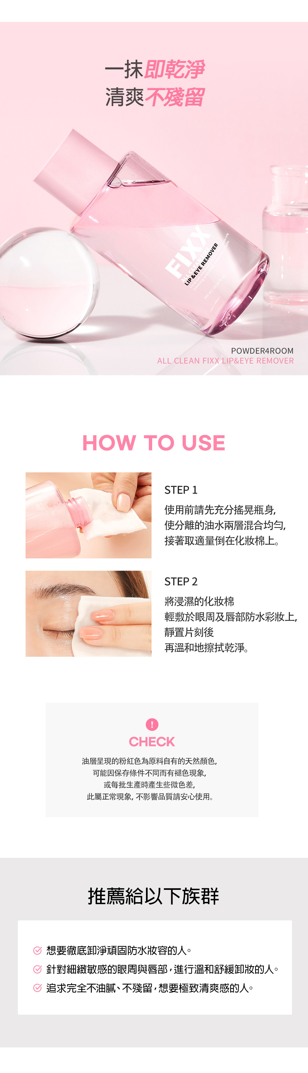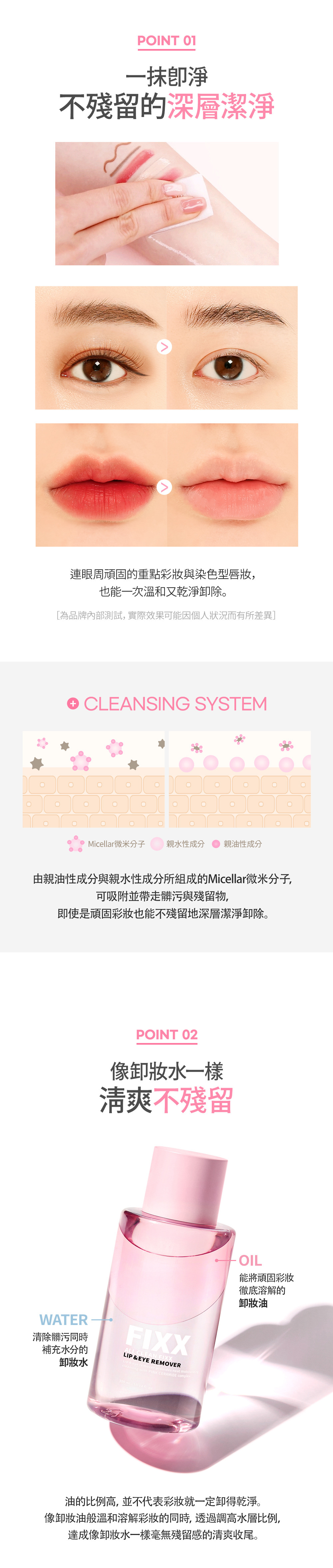• 防水睫毛膏、不掉色唇釉、亮片眼影,都能在不拉扯肌膚的情況下輕鬆卸除,減少眼周細紋產生。